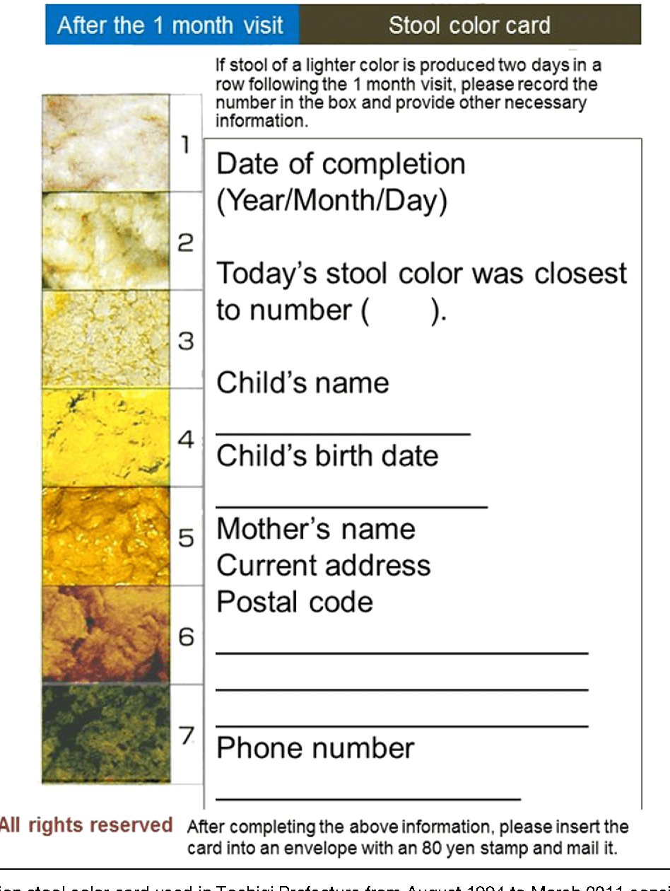 a sample of the current edition of stool color card used in the present - blanket check car seat check poop colour chart huh faculty of bile in | stool color chart biliary atresia.